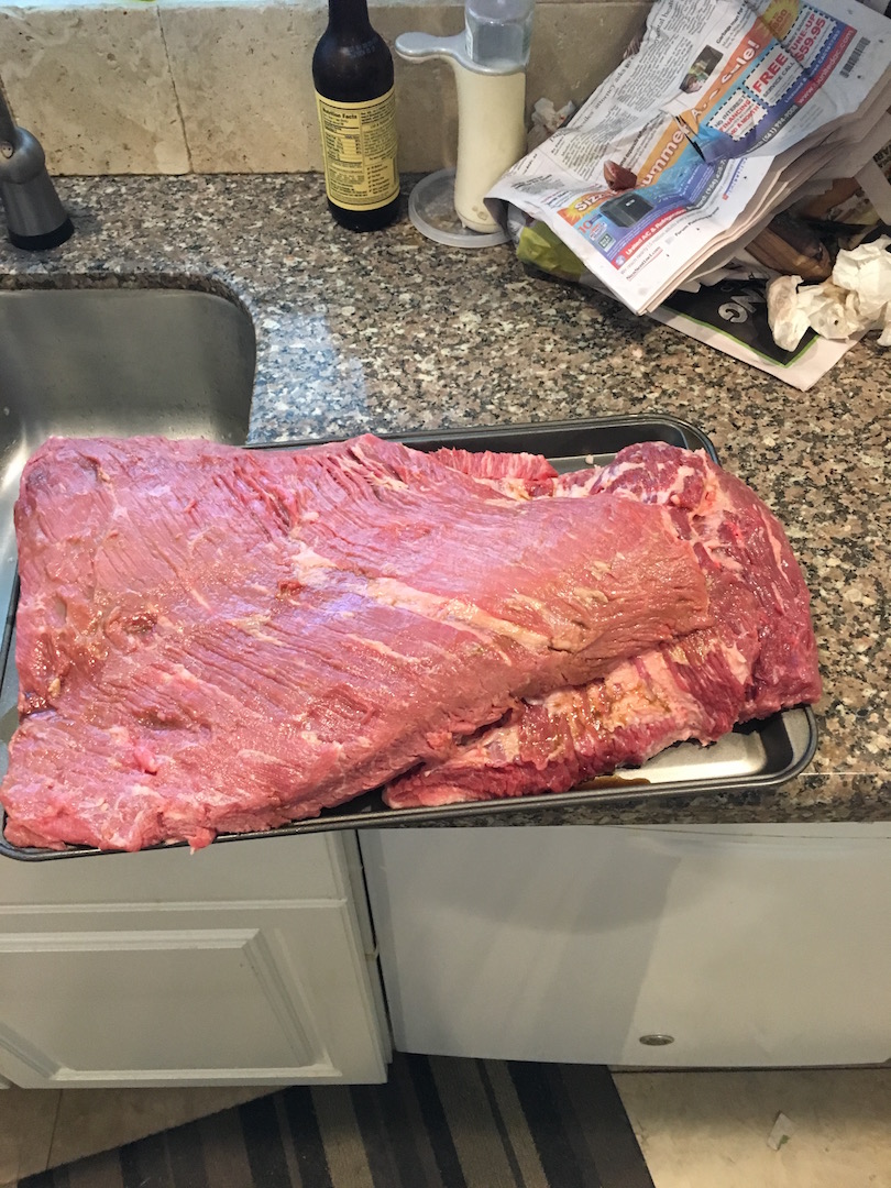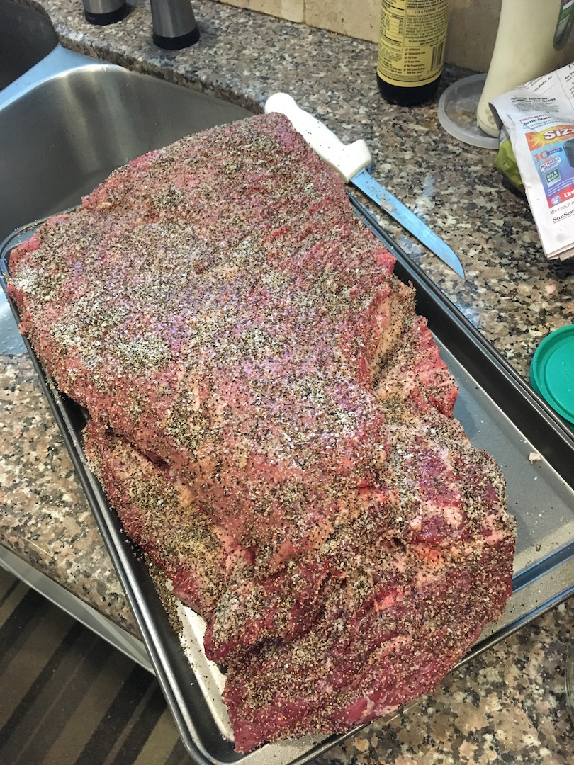- 2 16lb full packer choice briskets trimmed, salt and pepper rubbed, wrapped and ready, sitting in the fridge