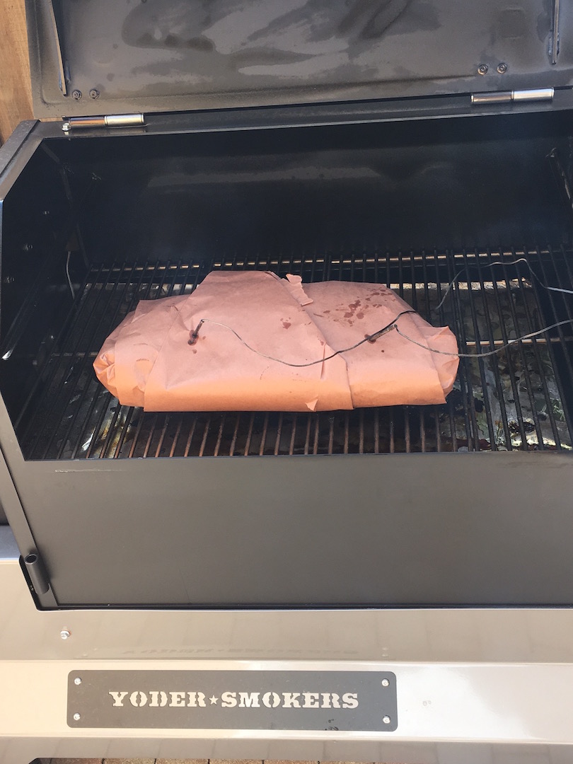probe is going in with little resistance, not quite butter, but getting pretty damn close. The whole brisket is nice and loose and jiggly, feels like jello. I was gonna run it thru naked the whole way. I've never tried wrapping in butcher paper before, but what the hell, I'm going for it.