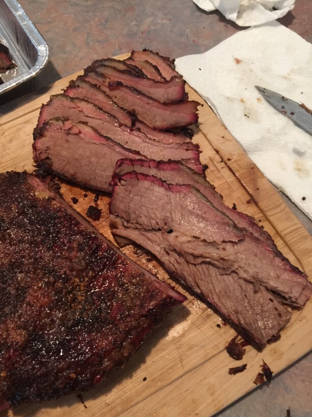 My first Brisket turned out as expected and if i could do anything different next time id wait til internal of 200 and not even wrap so the bark would be more of a sugar cookie crunch. Heres pics of finished/sliced product and of course "Burnt Ends" and they were Greattttttt!!