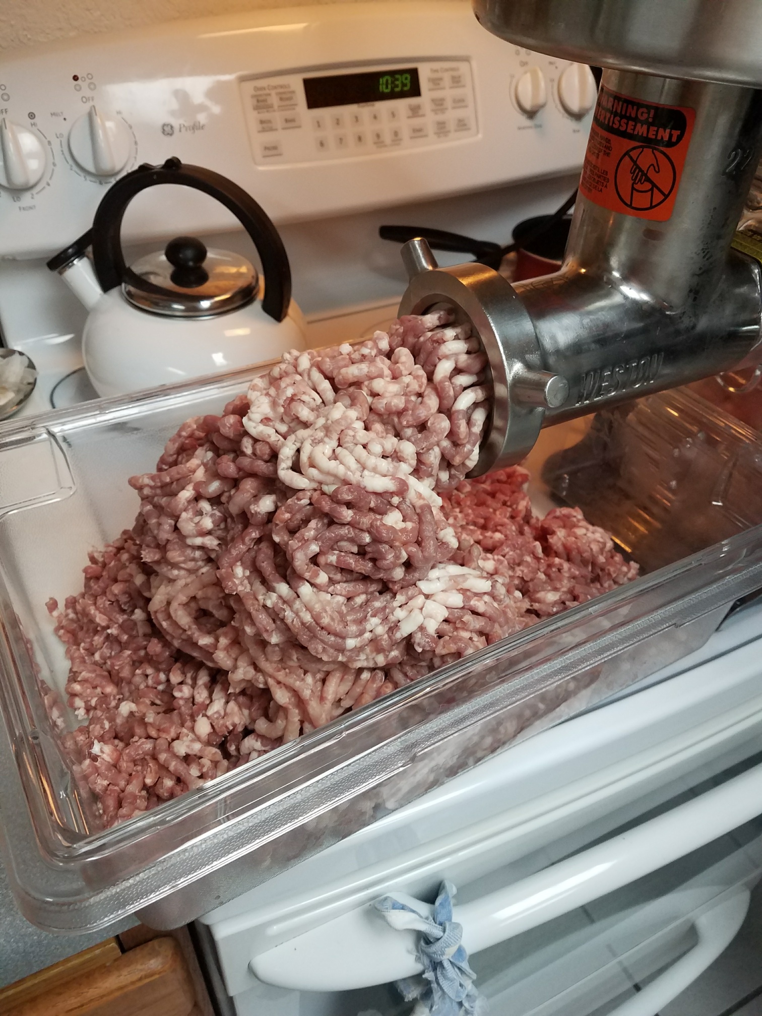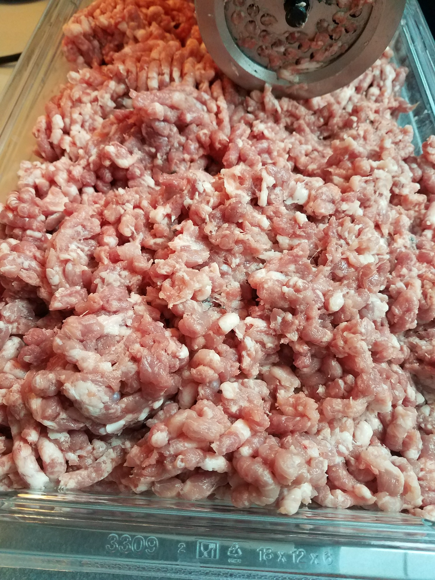 We started by putting a knife in the hand of our friend, and sat pork butts in front of him to cut up to grind. The recipe was for 10kg of sausage, so after cutting up 4 pork butts, we had enough to start grinding.