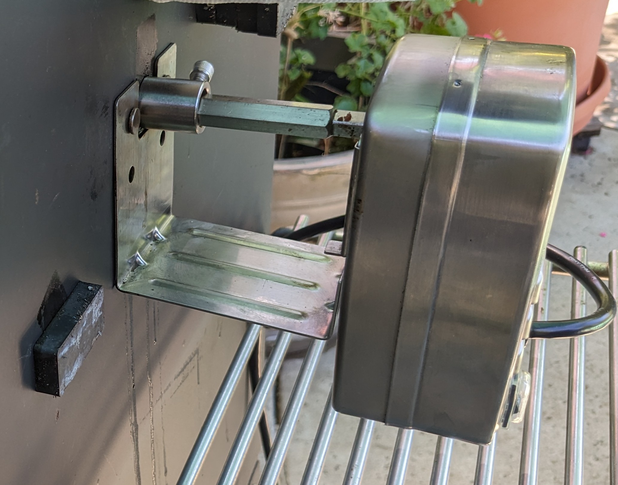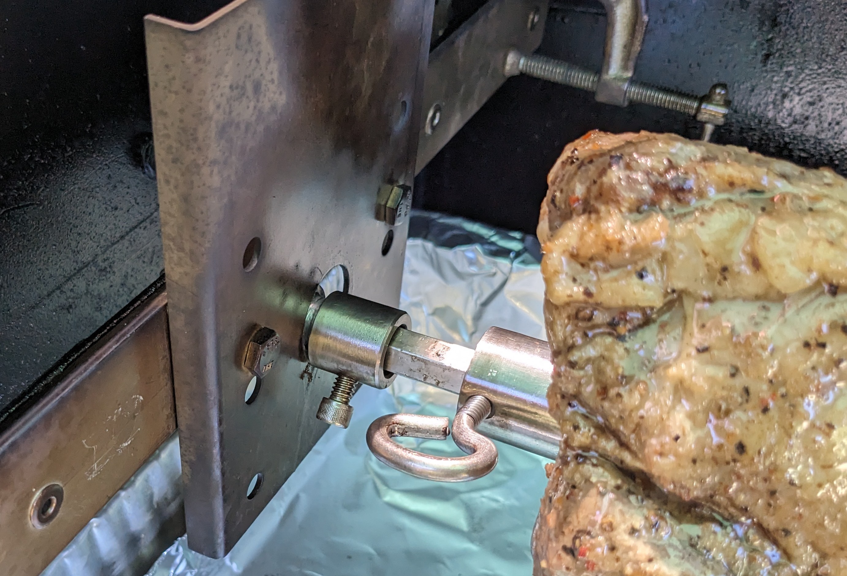I new to the forum but have been using my Y640 for several years now and just wanted to show you a couple of mods I've made and some tips I have for getting the most out of your great smoker! I added a home-made rotisserie and will try to upload a video of cooking a 24lb turkey and some picana steaks. I've cooked many things on the rotisserie. I also included some shots of the motor drive and the other supporting end of the rotating spit. Yoder should really sell this as an optional kit. It was easy to construct and install.