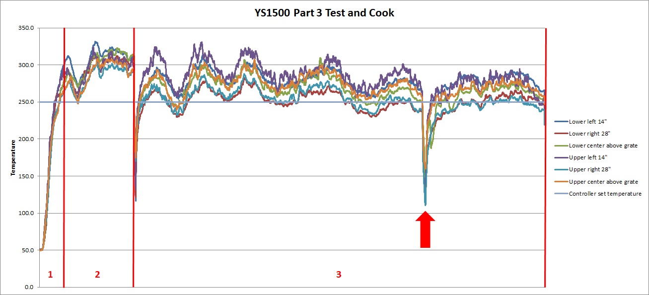 The first thing to understand is that this YS1500 is consistently reading hotter than the set temperature. In our experience, the more a cooker is used and seasoned, coupled with proper maintenance and cleaning, the better they perform, and the better they hold heat. We have numerous employees, and many YS1500 owners that have experienced the same results as documented here.