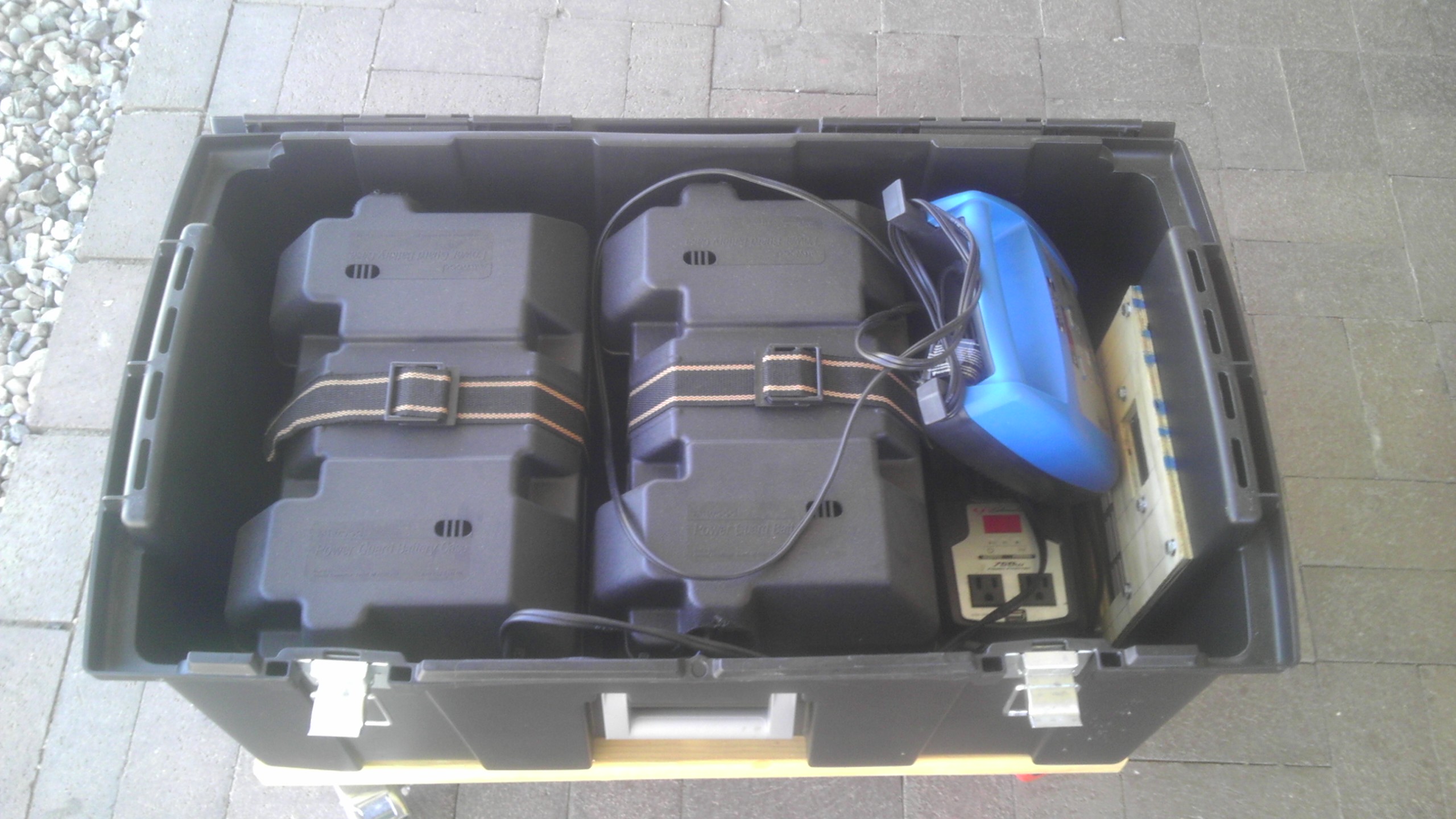 Here are pictures of the portable power box I made to run a YS1500 and a YS640 at BBQ Comps. This will run both cookers for an entire comp, and probably the entire weekend if needed. We also have run LED lights and an electric knife with no issues. Batteries are type 27 deep cycle and wired in parallel. The 12vdc inverter is wired by attaching the positive lead to one battery and the negative lead to the other battery. This allows the inverter to drain power from both batteries as though they were one big battery. The 12vdc charger is wired the same as the inverter.