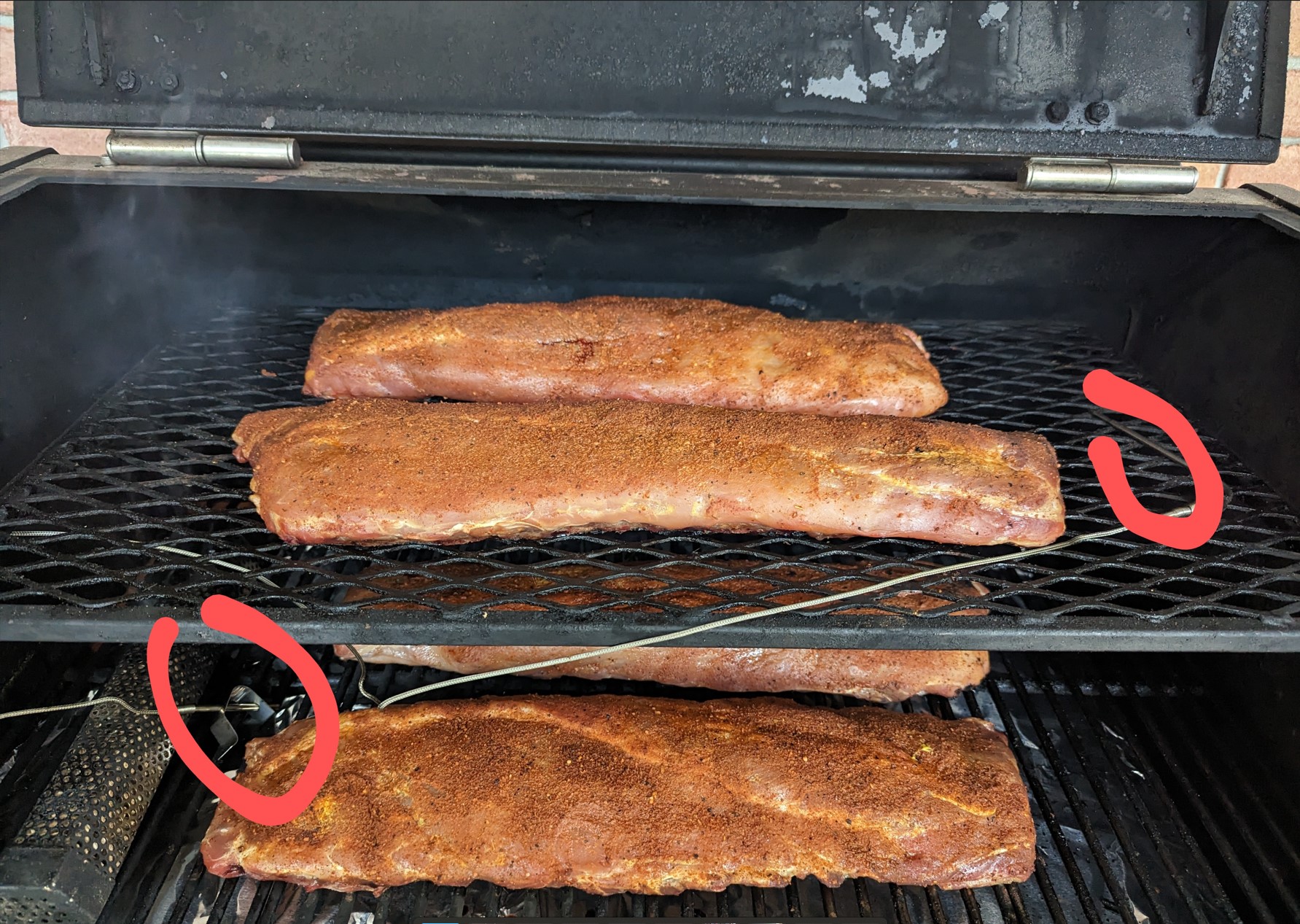 I started my cook (an hour ago) I used my standalone Fireboard with one probe on the far right-hand side of the upper grate (labeled probe 2), and another probe at the far left-hand side of the lower grate (labeled probe 3). I have the diffuser pulled all the way out.