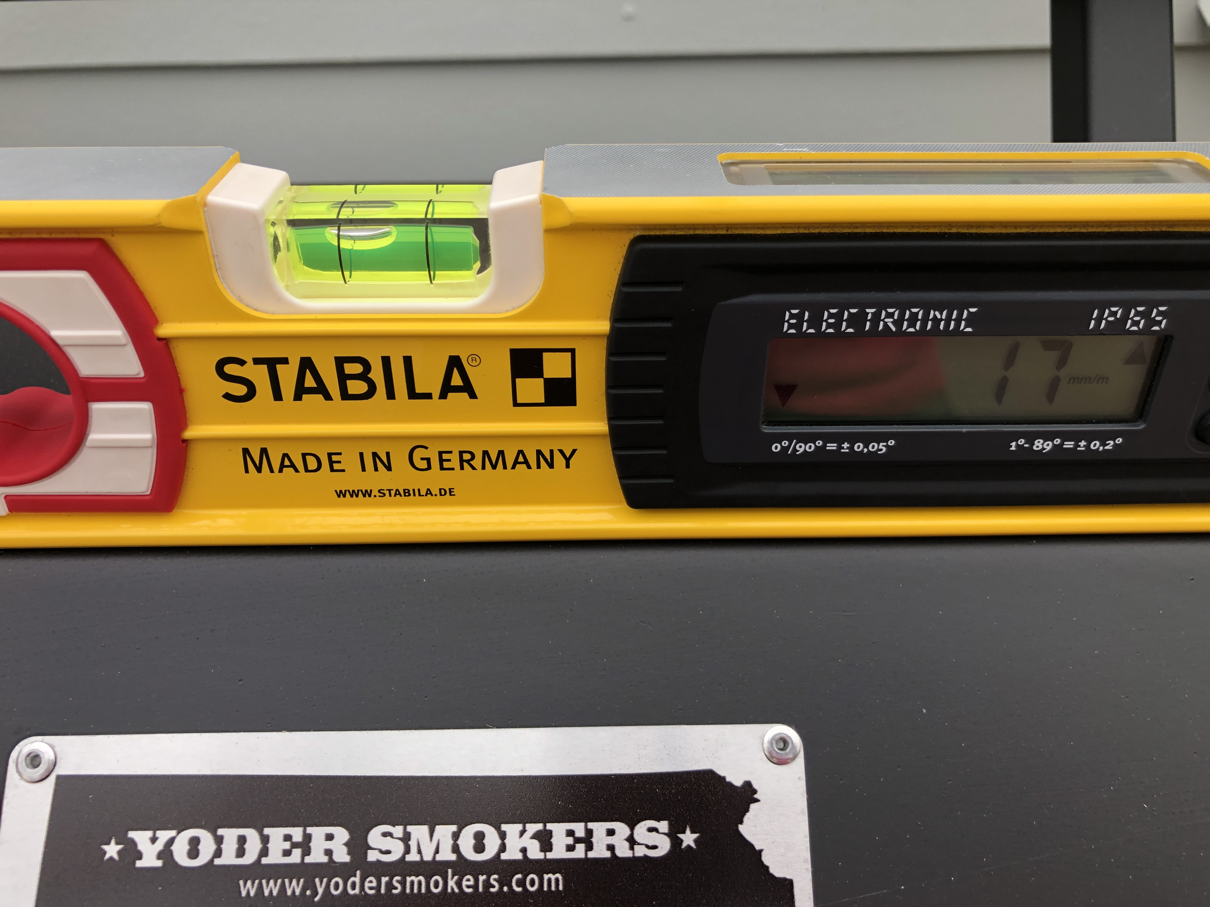 I recently purchased a YS480s and love it. However, I noticed that the entire unit is visibly sloping downhill (towards the chimney) by a reasonable amount : it's out between 13 and 17mm per m, depending on where one measures it. The terrace it sits on is also sloping in that direction, but at a lesser rate (about 7mm per m) - so if if that was accounted for, I've still got a downhill slope (to the right) of between 6-10mm per m on the Yoder itself. Is this acceptable? The fact that I get 2 different measurements depending on where I take them (on is atop the closed lid, the other on the bottom shelf just above the wheels) suggests that the entire 'chassis' isn't square.