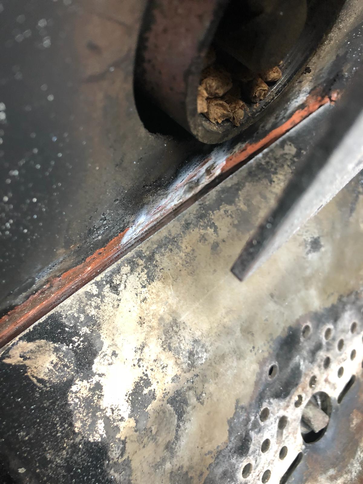 Theres black sealant around the firebox. Above the firebox is the orange sealant. It is cracker after two cookes.