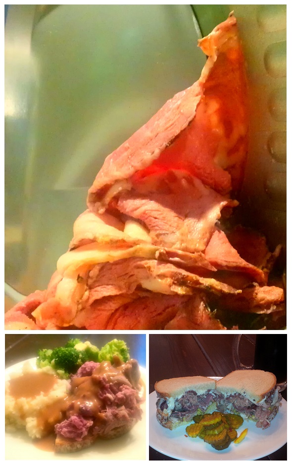 After a long rest, I sliced it up as thin as I could get it for open face roast beef sandwiches with garlic mashed potatoes and brown gravy. Used the leftovers for a roast beef sandwich with spicy pickles and something tall and cold for lunch.