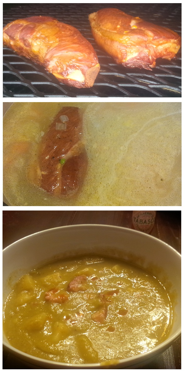 So fall finally hits with several days of rain, chilly nights and some color on the trees. Not quite the full PNW treatment, but enough to put you in the mood for some split pea soup. Pork goes into the pot with water, carrots, celery, onion and a package of dried split peas.