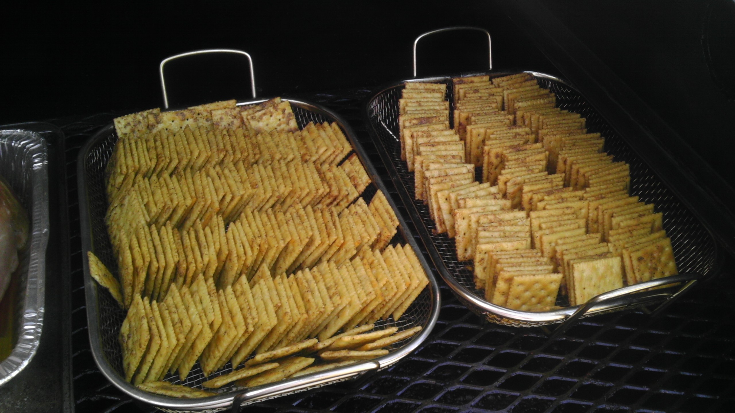 My wife does almost the same thing with soup crackers in the oven. She uses Hidden Valley Ranch and dill weed. We are going to "HAVE" to get em' smokey in the yoder!!!