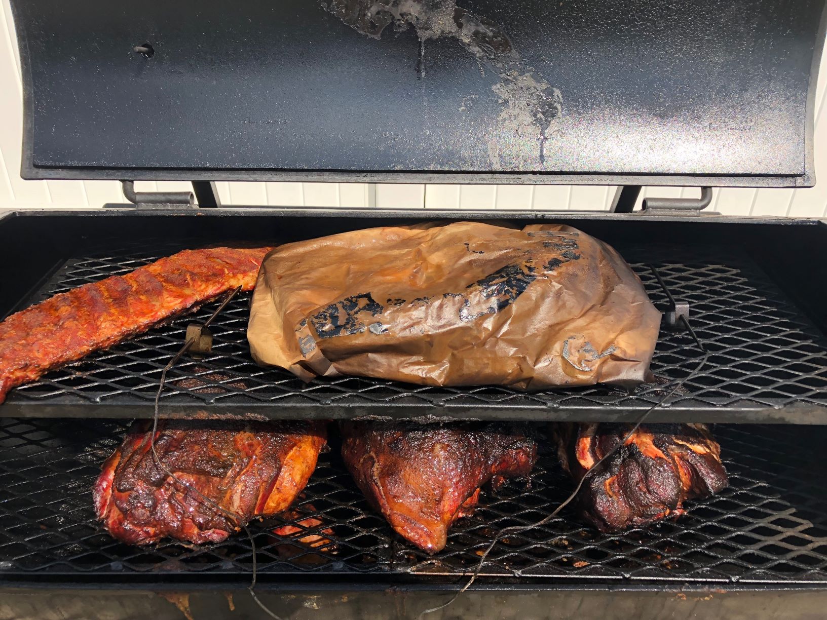 Decided if I was going to light a fire, I might as well load it up. So my first cook (and attempt) at using this smoker included a full brisket, three pork butts and a rack of spare ribs. Plus I decided to cook beans rather then use a water pan. Over 40lbs of meat and not too cheap. Learned alot about fire management along the way.