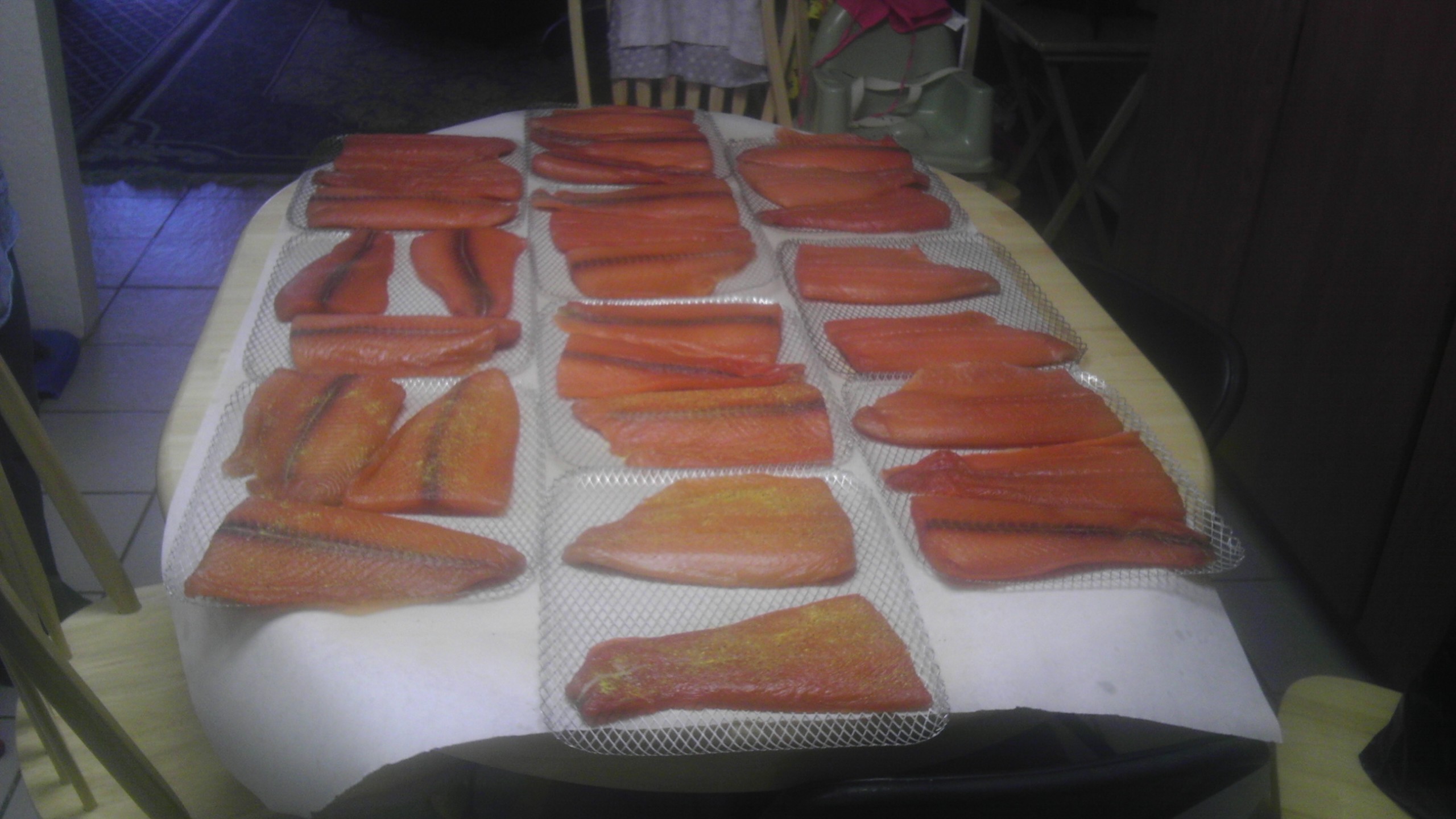 Here is a picture of the last time I brined and smoked salmon. A case of salmon fillets. These were all done on a YS1500 pellet cooker, using cookie cooling racks to quadruple the amount I could put in the smoker, which allowed me to do the whole case at once. Sorry about the bad picture, my old phone isn't what it used to be.