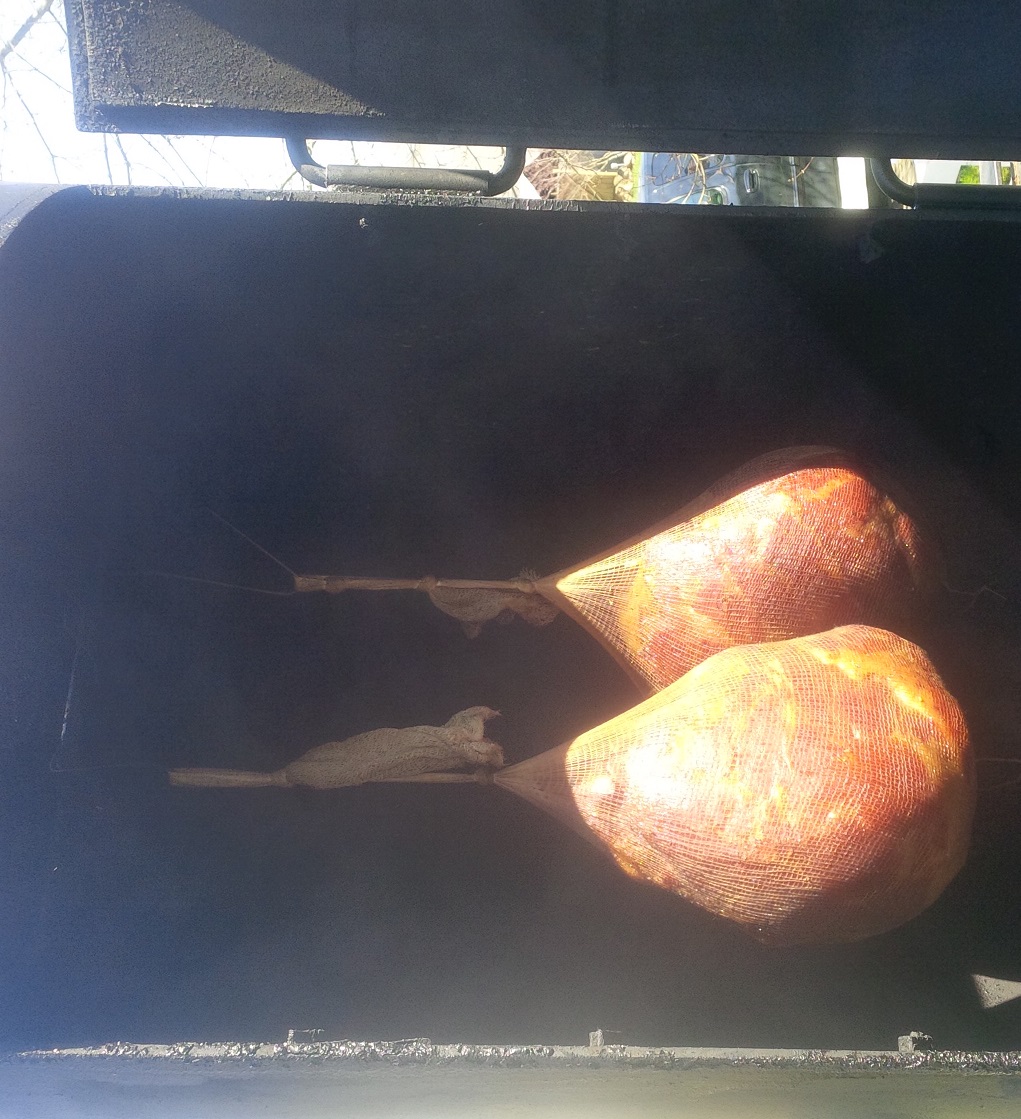 Smoked the hams for 10+ hours to an internal temp of 155. The instructions said to hang the ham for best results. I didn't have room to hang them vertically so I had to hang them horizontally. Don't think the end results qualifies as diet food though.