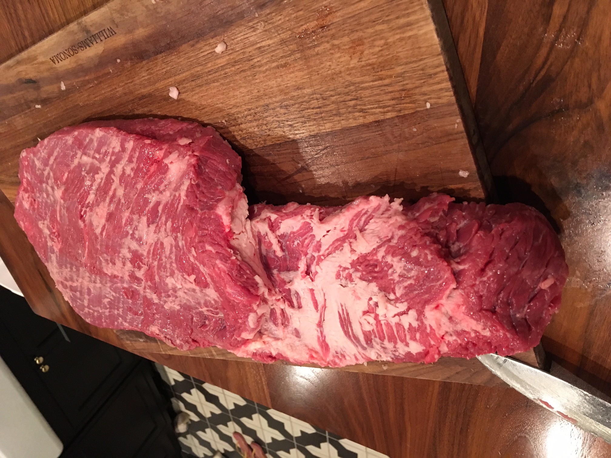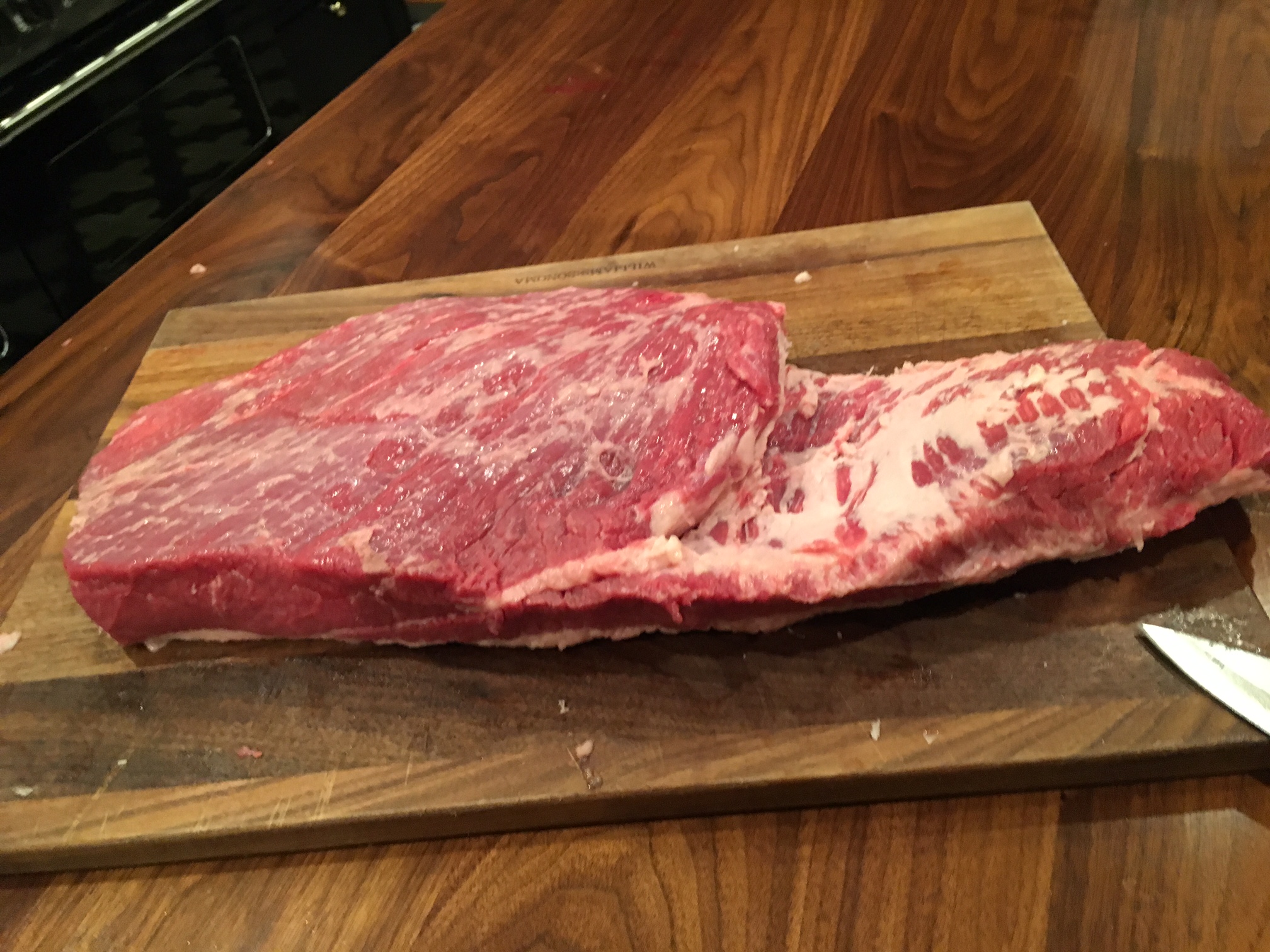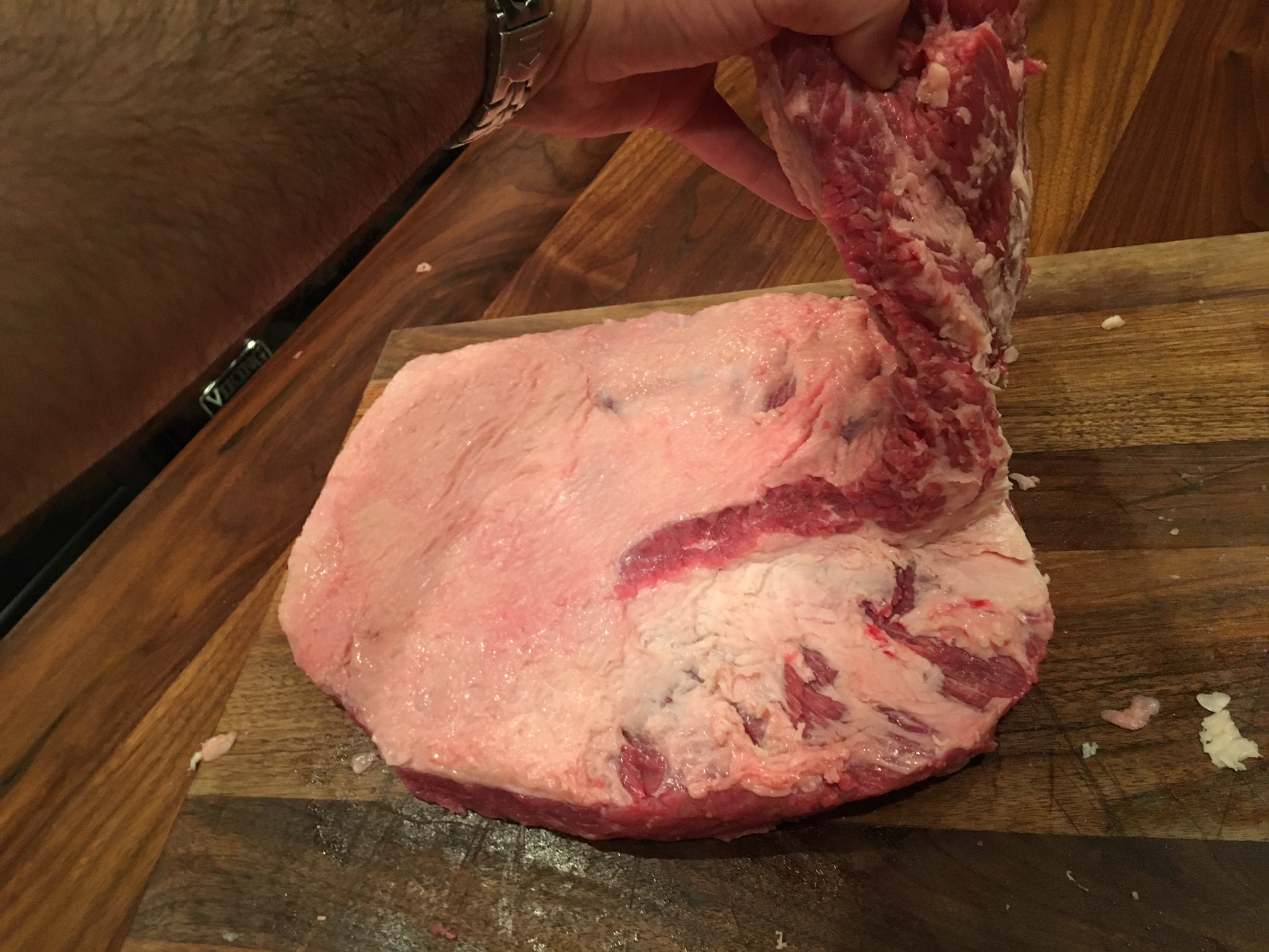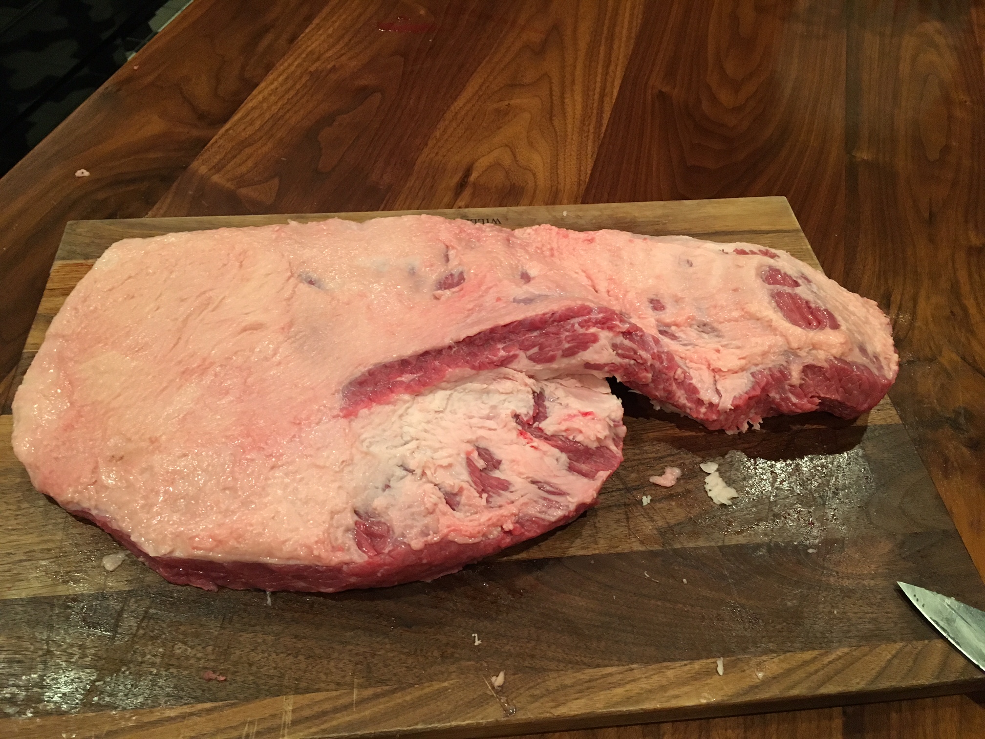 Anyways, here are pictures. I would normally think this trimming was way too aggressive, but pay attention to where the flat ends - there is barely any overlap with the point. The underside of the point was completely hard fat with no meat, so I cut that off because it definitely wouldn't have rendered.