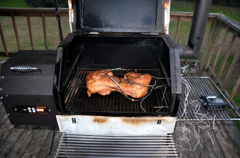 Put the Bird on the lower shelf and in a little less than 2 hours the breast probes were in range (160) and the dark meat probe was above 180. Took it off and tented it for about twenty minutes....