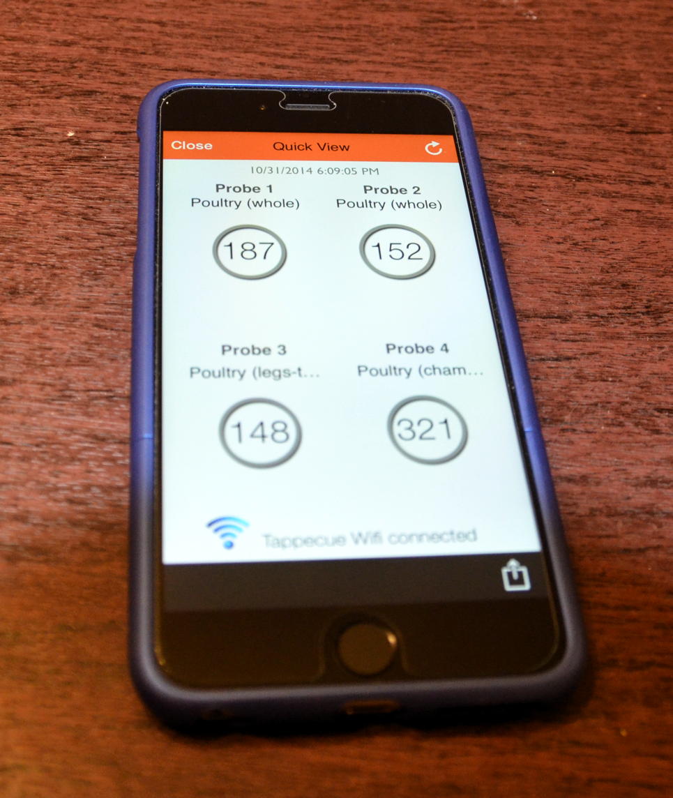 As for the Tappecue... Totally cool tool.... It has four ports that can be used for any combination of pit probes and food probes. It's networks with your home WiFi and can be read on your smart phone or tablet. Both Android and IOS apps available. It also graphs the entire cook so you can see what's going on from anywhere you have WiFi or Cell Service. After the session you can request the data to be emailed to you.... That part is a little cumbersome, but it does work. It's easier just to take a screen shot of the graph and email it to yourself. I'll try to attach some pics here.... I know.... In need of some serious wire management! :D