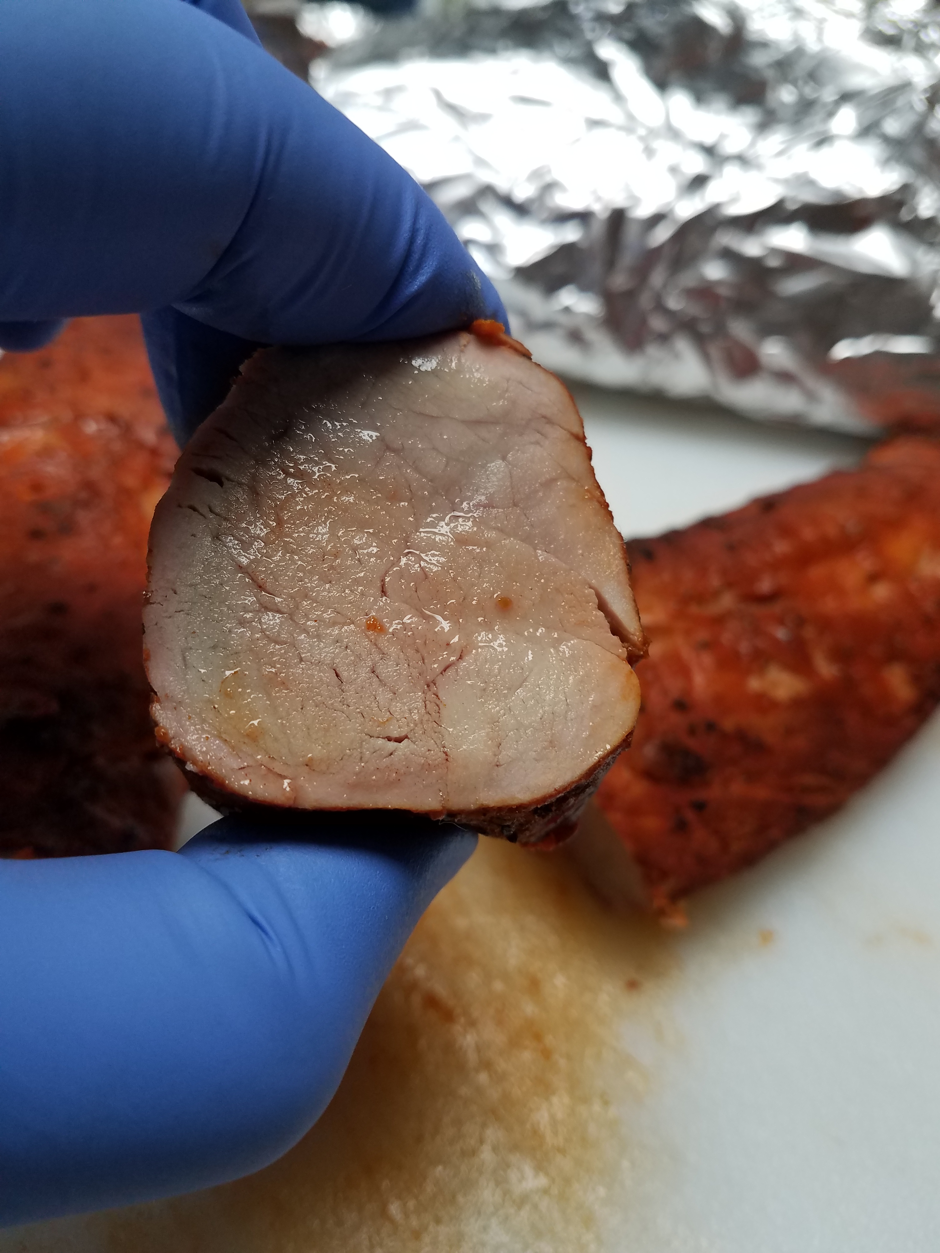 Once the meat hit an internal temperature of 140 (all of the meat was within 2 degrees of each other in the thickest part), we took the meat off the cooker, and placed each flavor duo in their separate foil pouches to rest (this is when we will apply sauce next time). We did this quickly so that the residual heat would allow the internal temperature to rise to approximately 145 before opening and cutting the tenderloins into medallions, or what everyone here calls marshmallows, as the center cuts are little pillows of pork goodness.