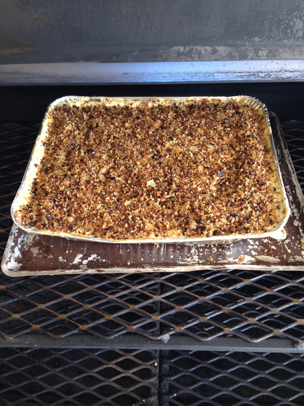 Turn up all sides of the ½ food pan to prevent spilling. Put the dry macaroni in the bottom of the pan. Evenly spread both cheeses over the top of the macaroni. Pour the milk, cream and the 8 ounces of the 505 chile puree into the pan. Season with your favorite spice(s) to your taste (I use my own seasoning blend). Stir everything in the pan together thoroughly. Put the pan on the smoker for about 2 to 2 ½ hours. Stir the contents in the pan thoroughly a couple of times, once at the 1 hour mark, and again just before you put on the bacon and Panko toppings. When the mixture just starts to bubble, it is time to put the bacon and Panko toppings on. After stirring the contents of the pan thoroughly, sprinkle the bacon evenly over the top of the mac & cheese and gently mix it into the mac & cheese. Now evenly distribute the Panko mixture over the top. After putting on the toppings, leave the pan on the smoker for an additional ½ hour. Remove from the cooker and let it sit for a few minutes to firm up, and enjoy.