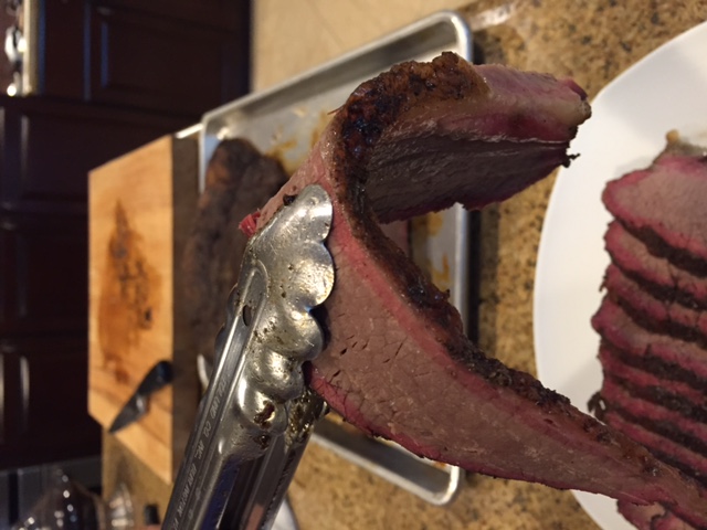 Bought 13lb Prime packer brisket from Costco. Trimmed out to 10.5lb, salt and pepper rub overnight and placed on top rack of smoker at 5:30am at 235 with hickory. Reached 165 with good bark after 5.5hrs. Wrapped in pink butcher paper and placed on lower rack and increased temp to 245. Stalled for 2 hrs and finished at 3:55pm when internal reached 200 and probe went in very easy. Set in cooler until 5:30pm - separated the point and cut up the flat. Fork tender and only the very thin ends shredded when I cut it. Tasted great and can't wait for the next one. 12hrs door to door.