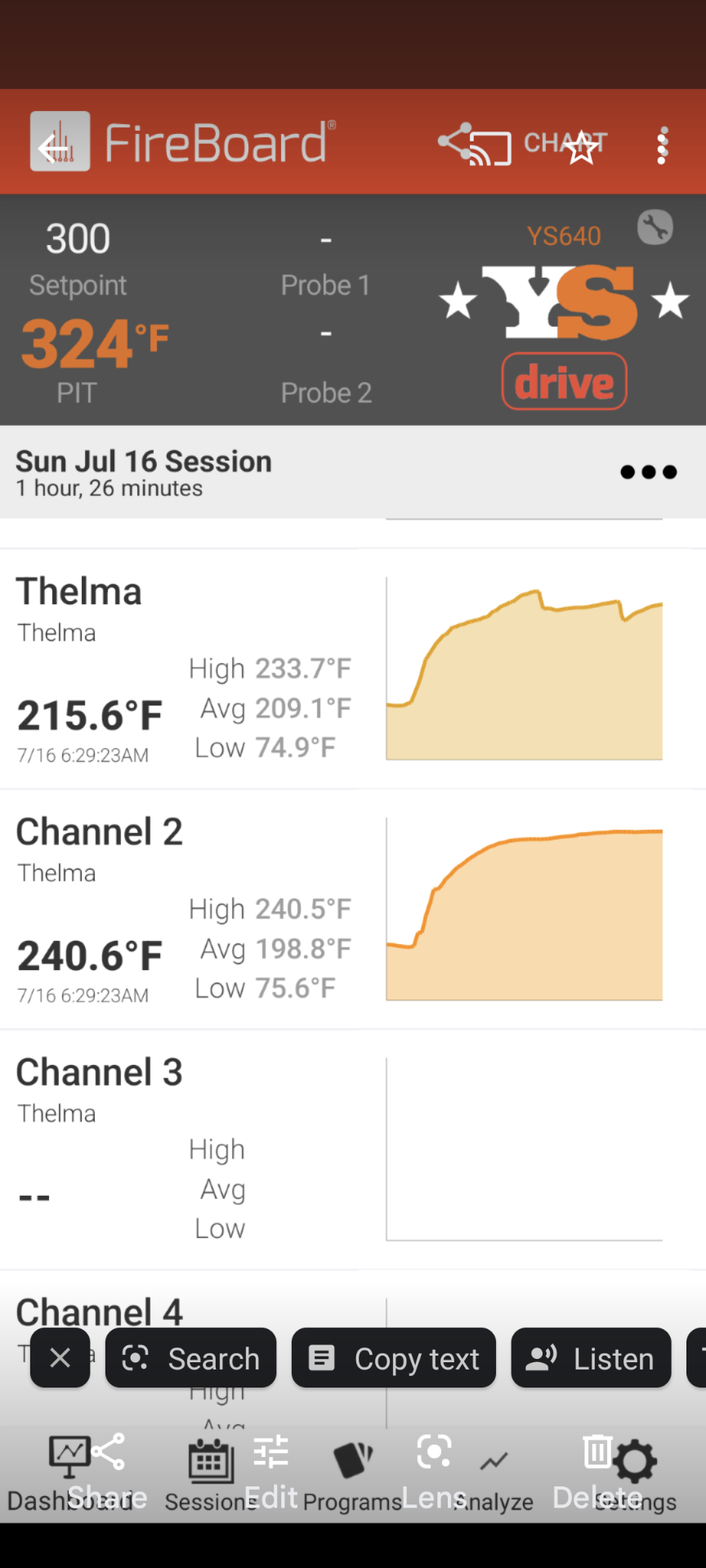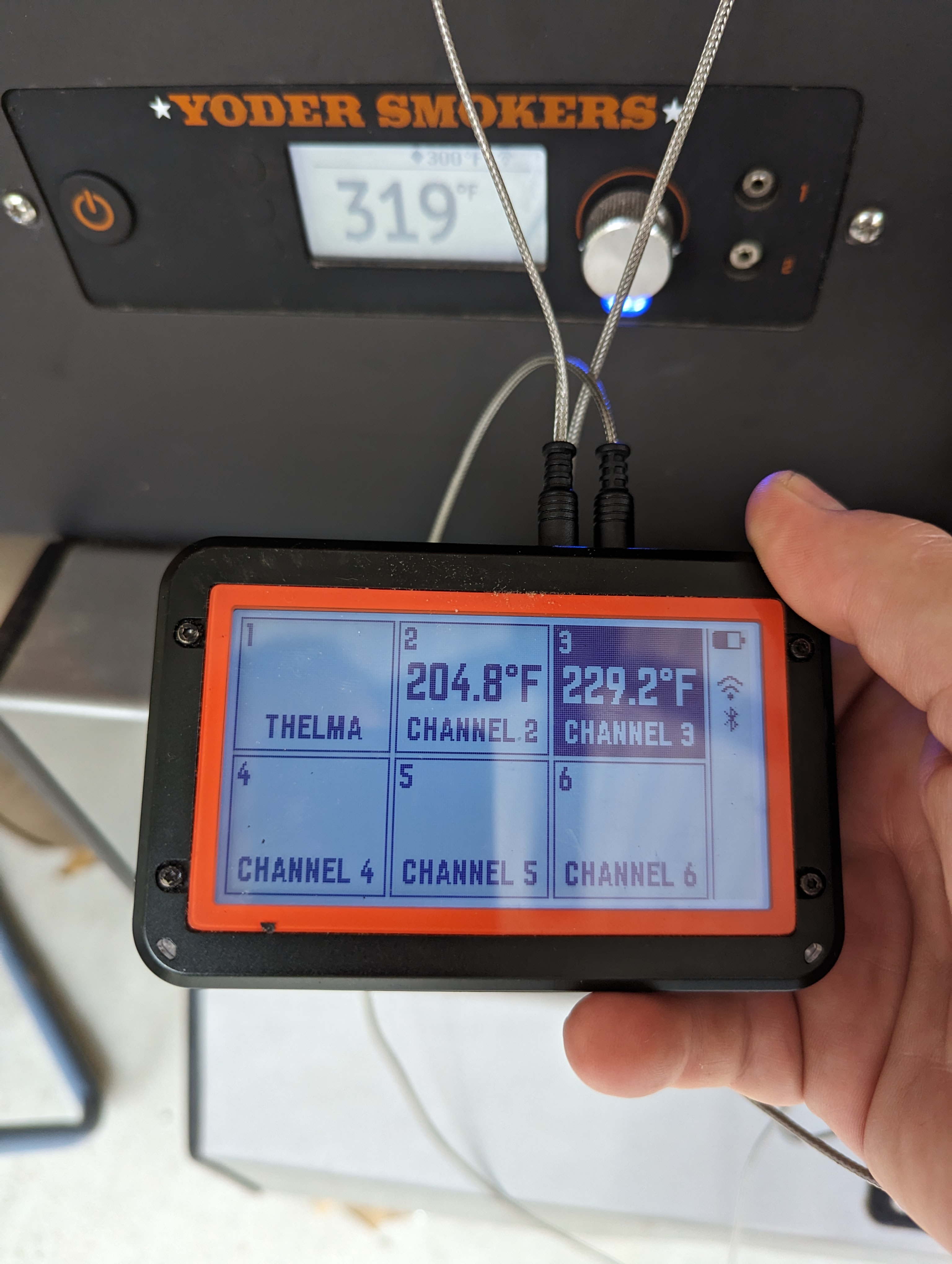 I started my cook (an hour ago) I used my standalone Fireboard with one probe on the far right-hand side of the upper grate (labeled probe 2), and another probe at the far left-hand side of the lower grate (labeled probe 3). I have the diffuser pulled all the way out.