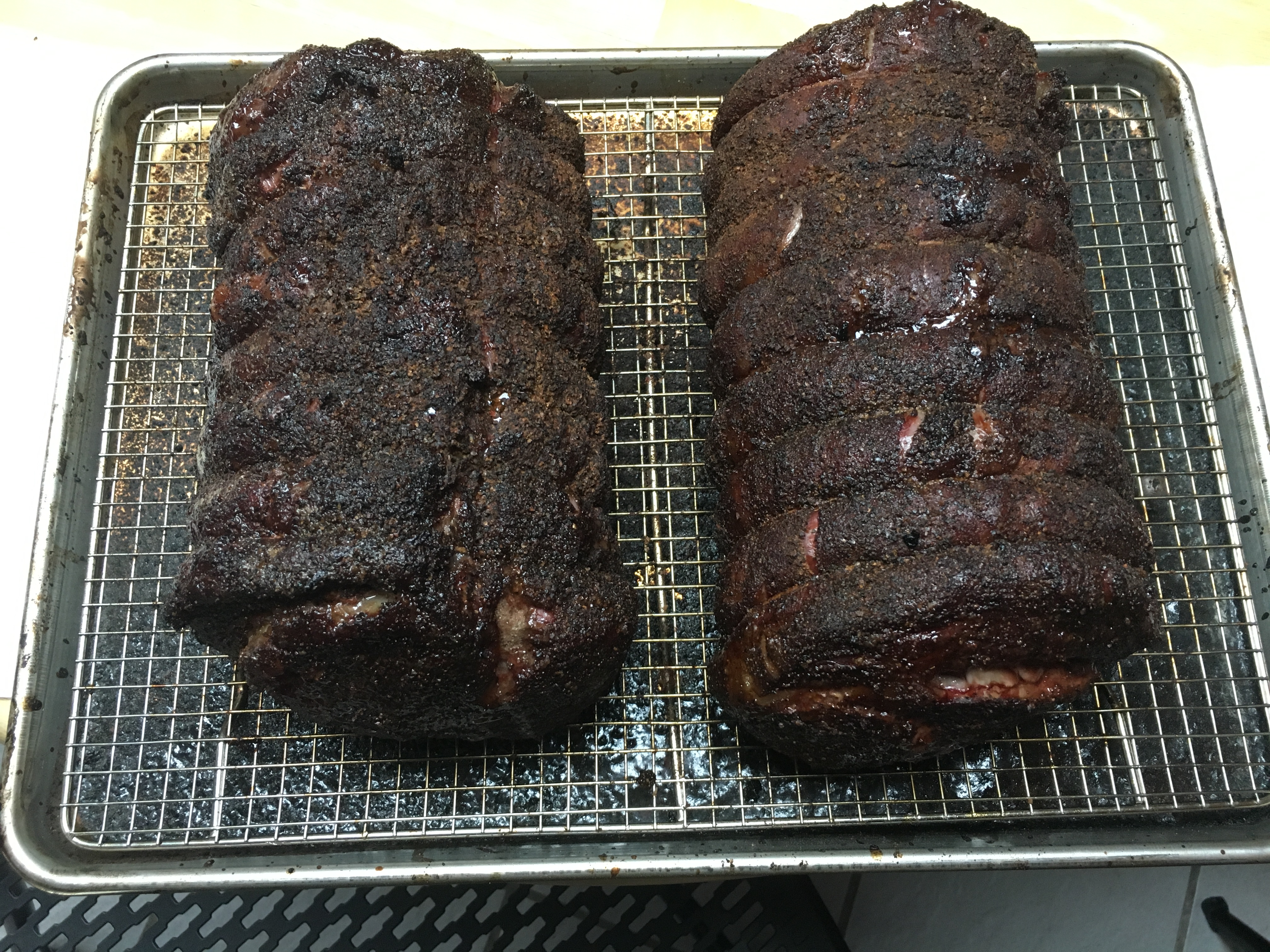 The YS1500 was set at 225. I think it took about 4 hours with them just right of center as in the picture. I did rotate them once after temping at about 2 hours. I took them off the YS1500 at about 128 degrees internal, and put them into the YS640 at 495 for about 15 minutes. The end result is what you see, which was 133-135 degrees internal.