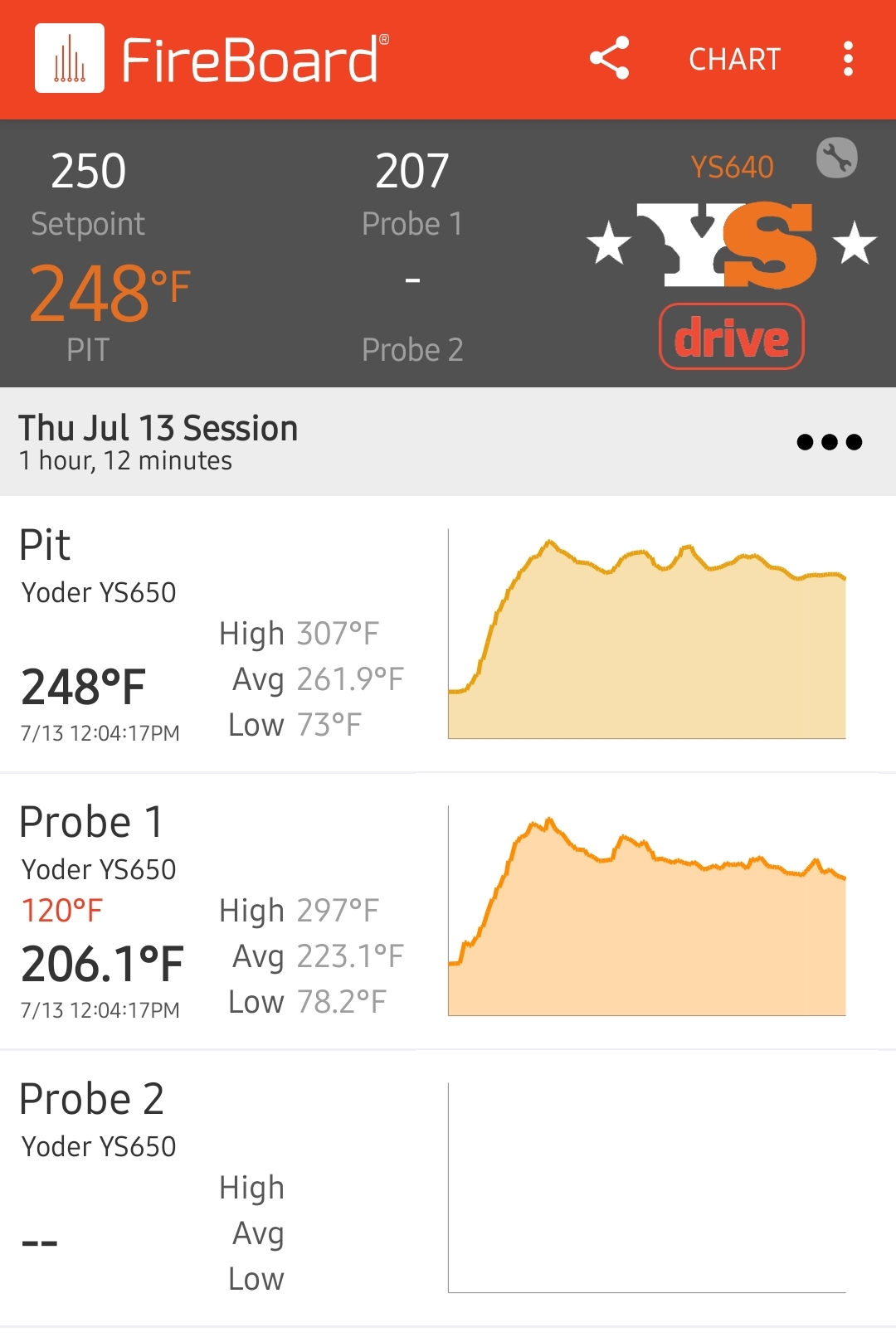 I started my cook (an hour ago) I used my standalone Fireboard with one probe on the far right-hand side of the upper grate (labeled probe 2), and another probe at the far left-hand side of the lower grate (labeled probe 3). I have the diffuser pulled all the way out.