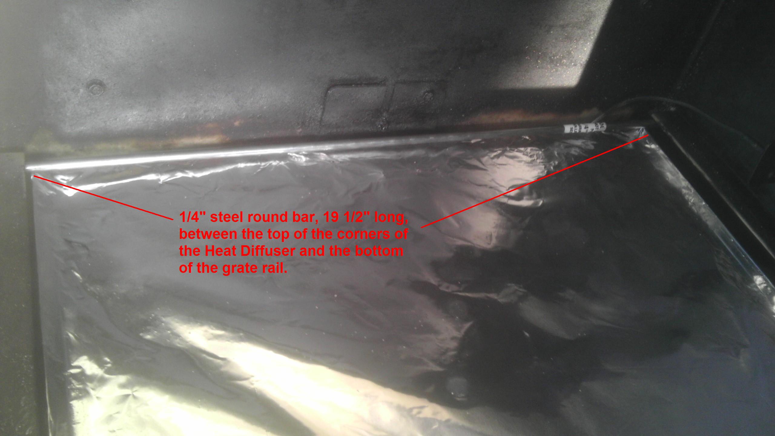 There is a very simple fix for this warping. Purchase a piece of 1/4" steel round bar, 19 1/2" in length from your hardware store (do not use galvanized rod, plain untreated metal rod is best). Place the round bar between the top of the diffuser and below the grate rail. This will force the corners back into position and bring your cooker temperatures back to normal. IF YOUR CORNERS ARE NOT WARPED UP, YOU DO NOT NEED TO DO THIS FIX.